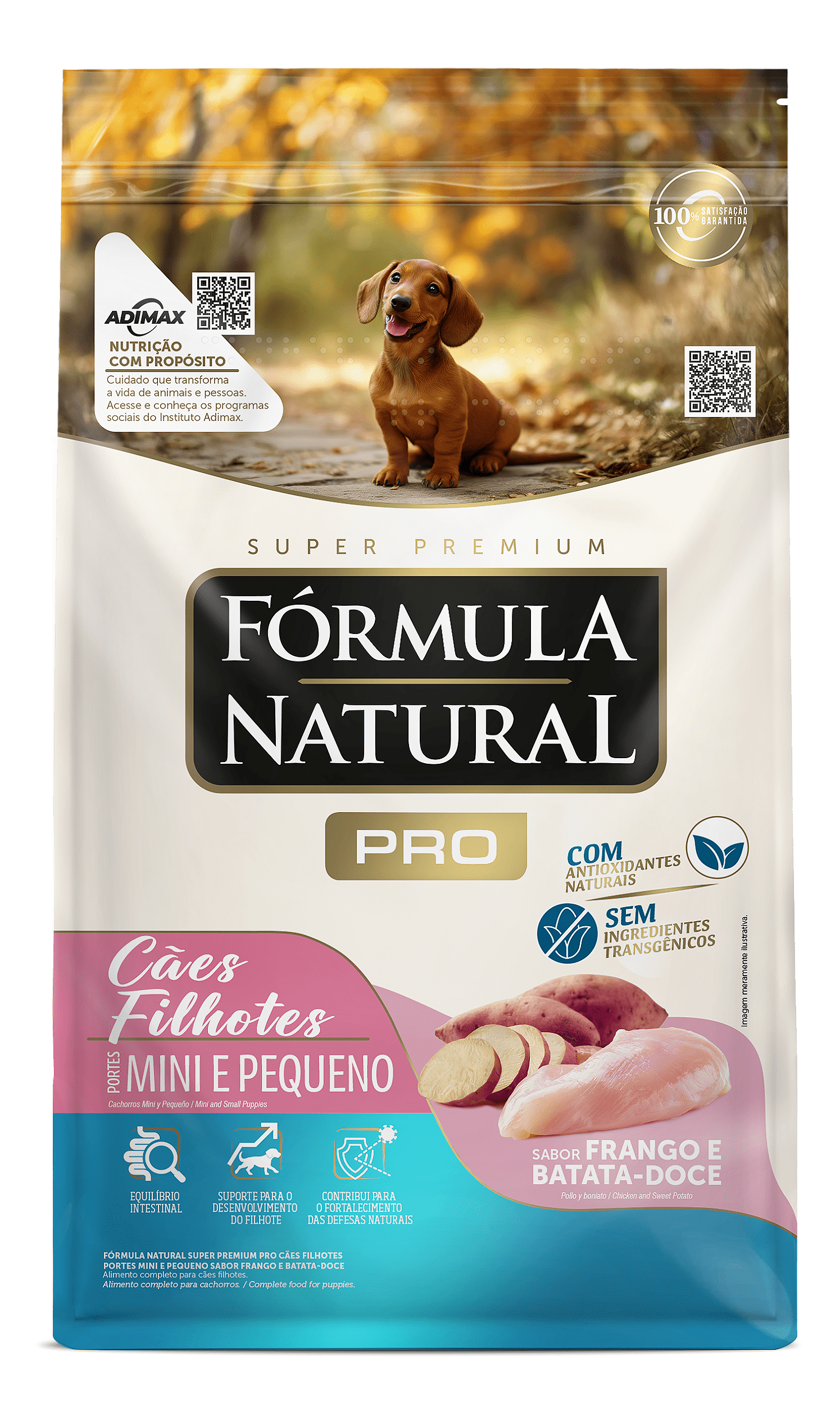 A Ração Fórmula Natural PRO Filhotes Raças Mini e Pequenas é um alimento Super Premium Natural, formulado cientificamente para atender às necessidades nutricionais de cães filhotes de pequeno porte desde o desmame até a fase adulta. Com proteínas nobres de frango e peru, oferece alta digestibilidade, suporte ao crescimento e desenvolvimento equilibrado.