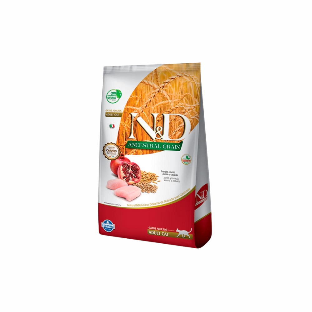 A linha N&D Ancestral para gatos oferece alimento super premium com baixo índice glicêmico e ingredientes de alta qualidade. A versão Frango Adulto é formulada para promover digestibilidade superior e suporte ao sistema urinário e condição corporal dos felinos. :contentReference[oaicite:0]{index=0}