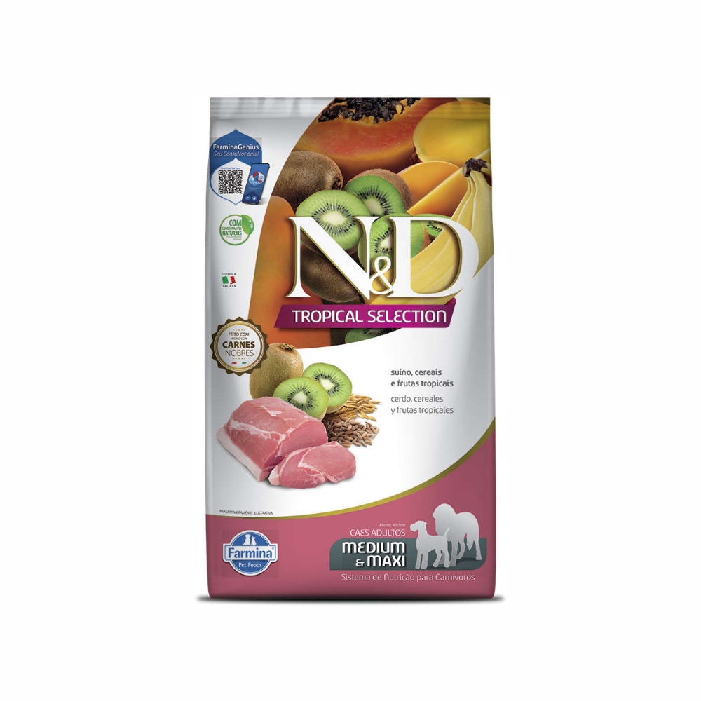 A N&D Tropical Selection Suíno é uma ração super premium desenvolvida para atender às necessidades nutricionais de cães adultos de porte médio e grande. Formulada com carne suína de alta qualidade e frutas tropicais como mamão, manga e kiwi, oferece uma alimentação completa, saborosa e naturalmente saudável.