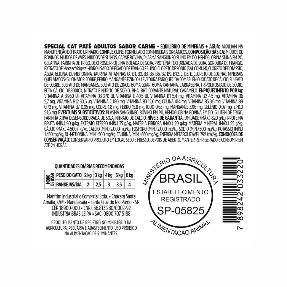 O Patê Special Cat Adulto Carne 100g é um alimento úmido completo, desenvolvido para agradar o paladar exigente dos gatos adultos. Sua textura macia e sabor marcante tornam a refeição ainda mais atrativa.