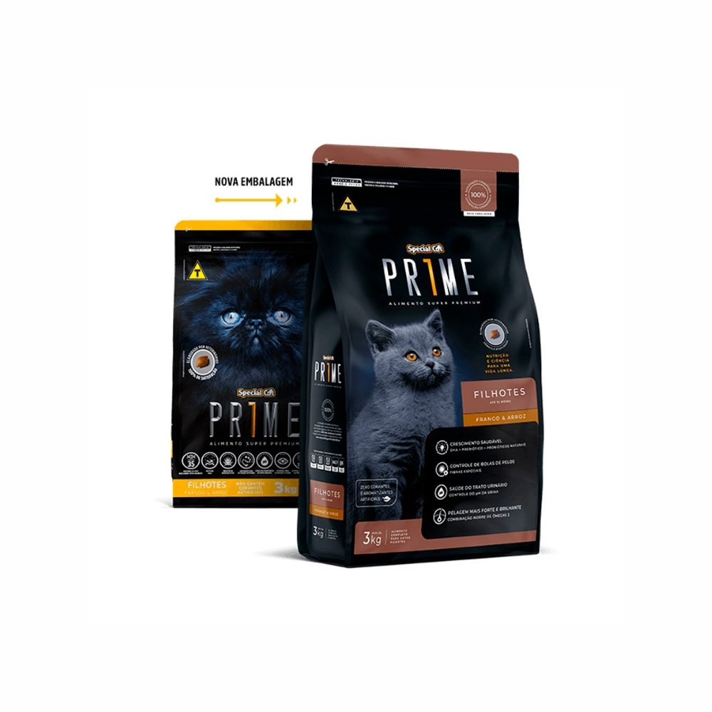 Special Cat Prime Filhotes Frango e Arroz 1kg apoia crescimento saudável e nutrição completa para filhotes.